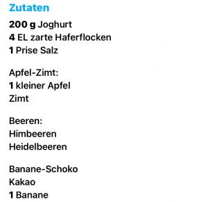 Kalte Frühstücksbowl nach deinem Geschmack. Joghurt und Haferflocken, kombiniert mit frischen Früchten / Nüssen und Gewürzen.